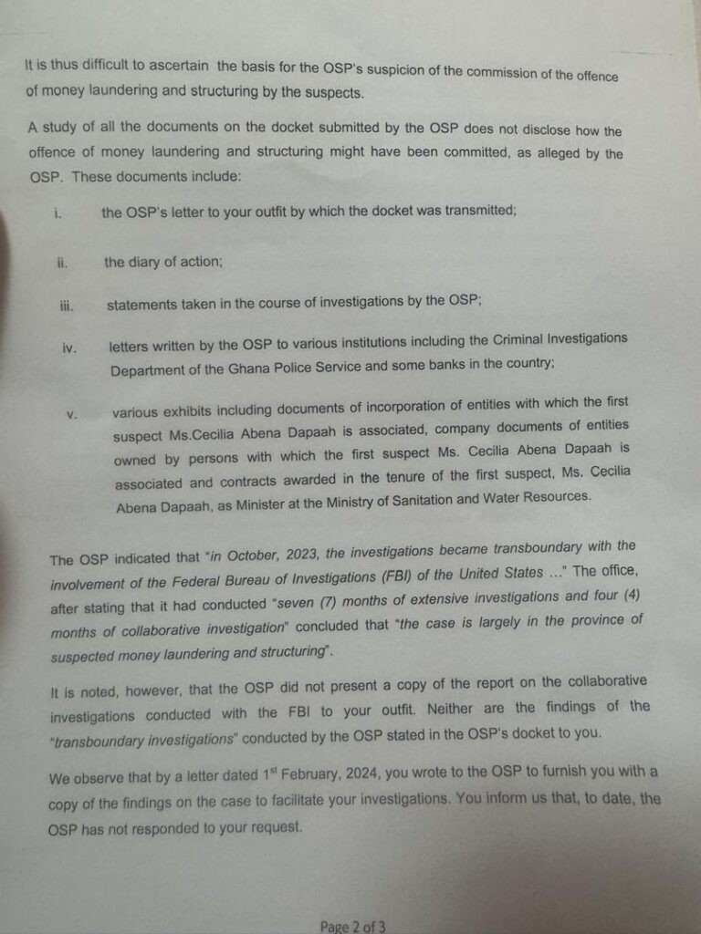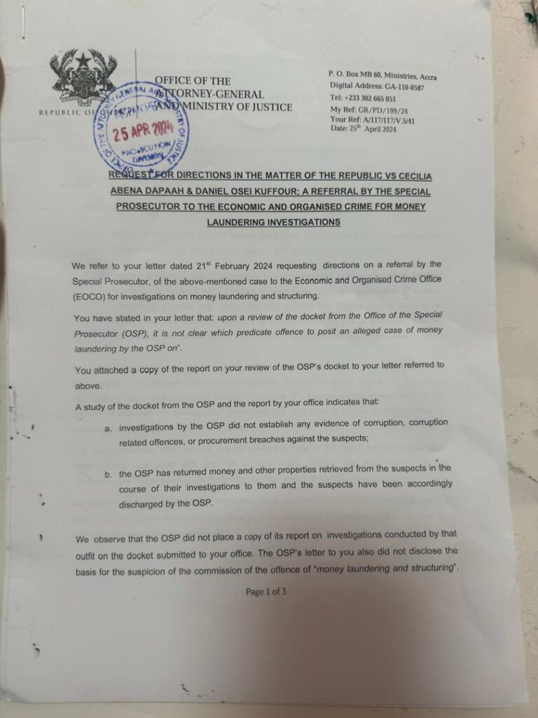 The Office of the Attorney-General (AG) has stated that there are no grounds to investigate the former Minister for Sanitation and Water Resources, Cecilia Dapaah, and her husband for money laundering, as recommended by the Special Prosecutor, Kissi Agyebeng.