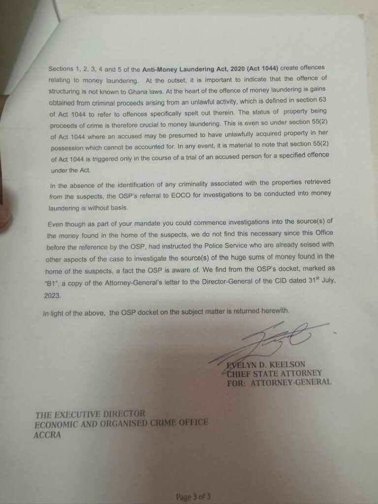 The AG added, “… In the absence of the identification of any criminality associated with the properties retrieved from the suspects, the OSP’s referral to EOCO for investigations to be conducted into money laundering is without basis”.