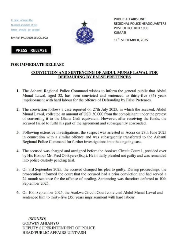 After extensive investigations, Lawal was arrested in Accra on June 27, 2025, in connection with a similar offence and later transferred to the Ashanti Regional Police Command.