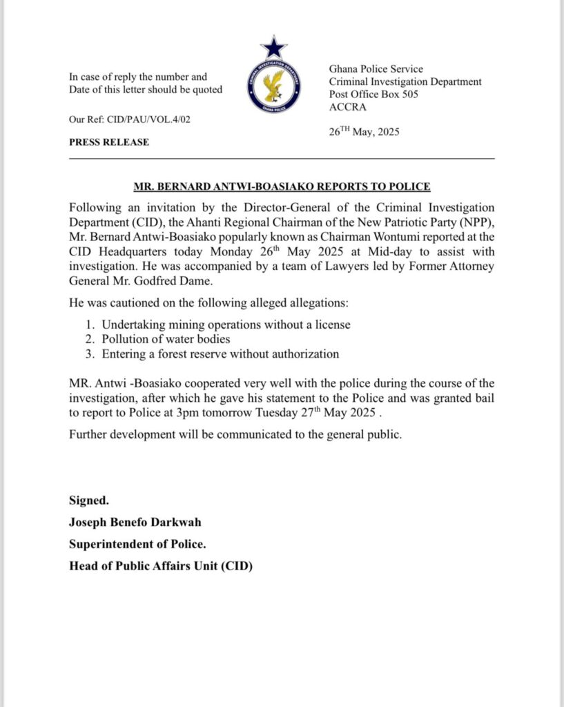 Police officials confirmed that the NPP regional chairman fully cooperated during the session and provided a formal statement. He was subsequently granted bail and is expected to report back to the CID at 3 p.m. on Tuesday, 27 May 2025.