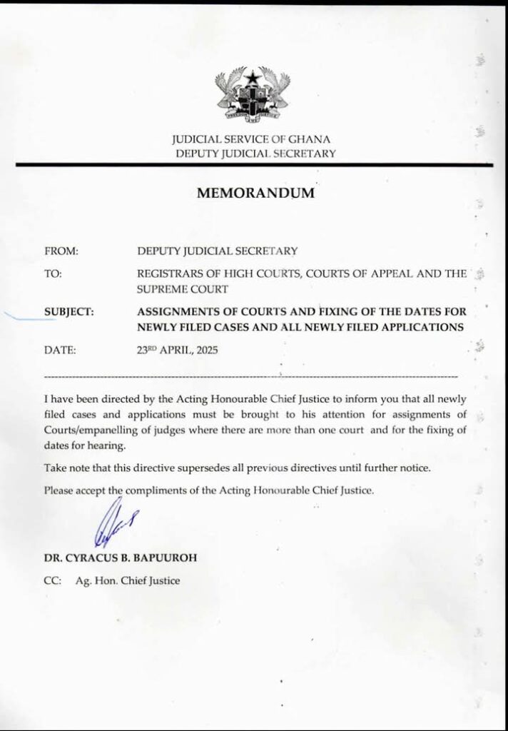 The memo issued and signed by Deyputy Judicial Secretary, Dr. Cyracus B Bapuuroh on April 23, 2025 stated that, “I have been directed by the Acting Honourable Chief Justice to inform you that all newly filed cases and applications must be brought to his attention for assignments of Courts/empanelling of judges where there are more than one court and for the fixing of dates for hearing.