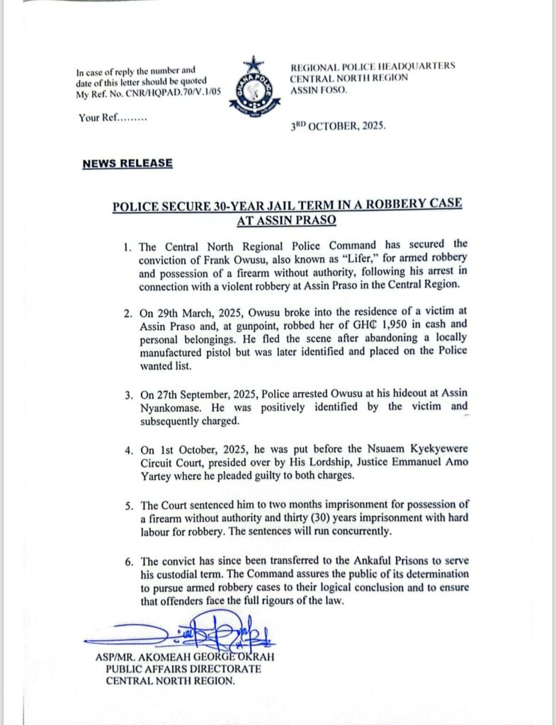 The Central North Regional Police Command has secured the conviction of Frank Owusu, popularly known as Lifer, for armed robbery and unlawful possession of a firearm, following his involvement in a violent robbery at Assin Praso in the Central Region.