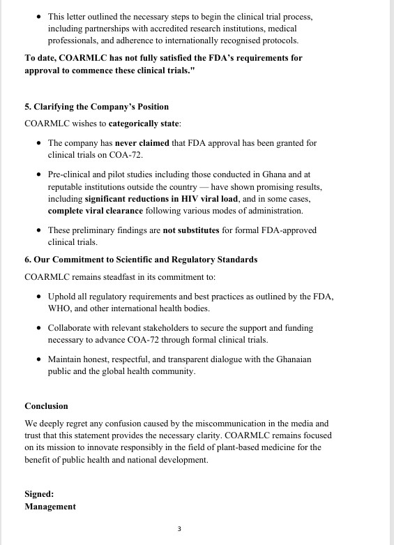 In a statement released on Monday, July 28, 2025, and signed by management, COARMLC described the front-page report published by the Daily Graphic on Wednesday, July 16, 2025, as “misleading and inaccurate.” The company stressed that at no point did it claim that COA-72 had entered official clinical trials for HIV treatment.