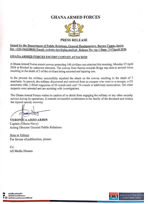 According to the Ghana Armed Forces, unknown gunmen launched the ambush along the Bawku–Bolgatanga route, firing indiscriminately at the convoy.