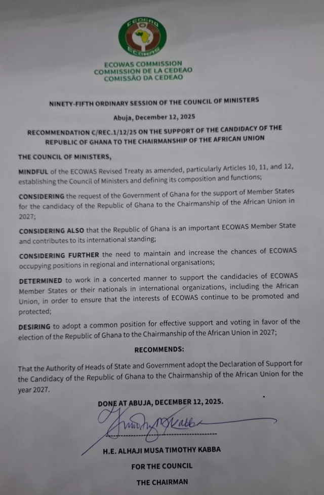 The ECOWAS Council of Ministers has unanimously endorsed Ghana’s President John Dramani Mahama as the sole West African candidate for the position of Chairperson of the African Union (AU) when the rotational leadership reaches the sub-region in 2027.