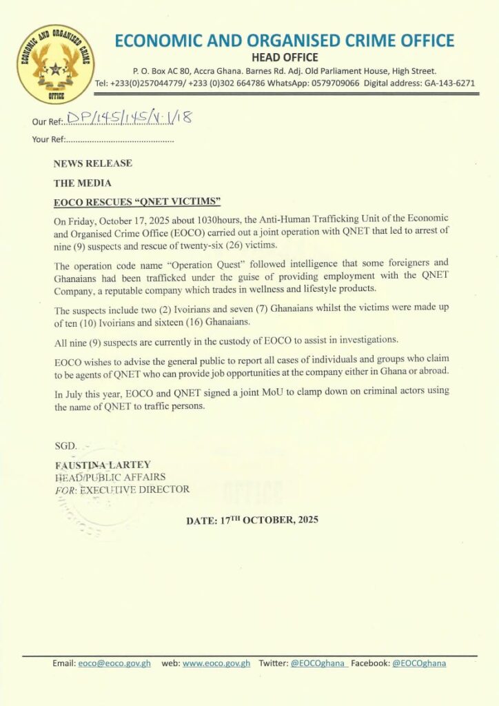 This operation follows a Memorandum of Understanding signed in July 2025 between EOCO and QNET aimed at cracking down on criminal networks misusing QNET’s name to perpetrate human trafficking and related offences.