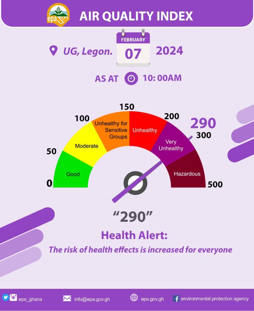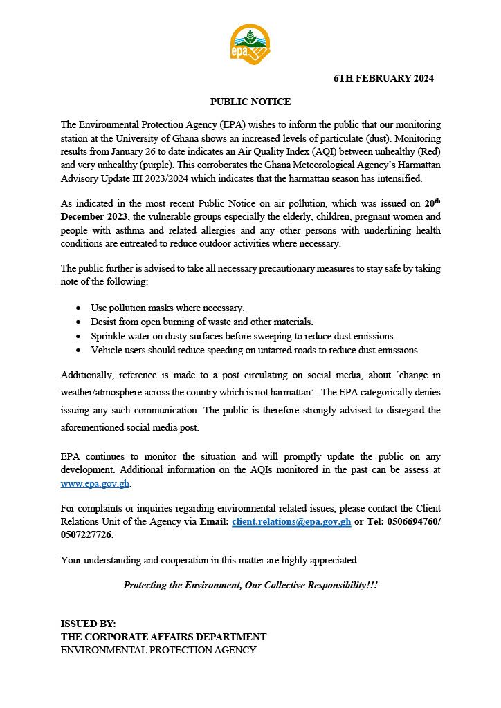The Environmental Protection Agency (EPA) wishes to inform the public that our monitoring station at the University of Ghana shows an increased levels of particulate (dust). Monitoring results from January 26 to date indicates an Air Quality Index (AQT) between unhealthy (Red) and very unhealthy (purple). This corroborates the Ghana Meteorological Agency’s Harmattan Advisory Update III 2023/2024 which indicates that the harmattan season has intensified.