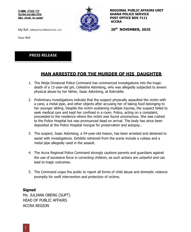 The Weija Divisional Police Command has arrested a 54-year-old man, Isaac Adonteng, after his 13-year-old daughter, Celestine Adonteng, was found unconscious and later pronounced dead at the Police Hospital. Preliminary inquiries indicate the child suffered severe physical assaults at the hands of her father.