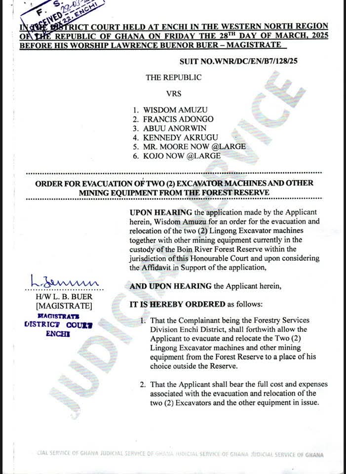 The order, issued by His Worship Lawrence Buenor Buer on Friday, March 28, grants the accused, Wisdom Amuzu and his five other associates, the right to relocate the equipment to a place of their choice outside the forest reserve.