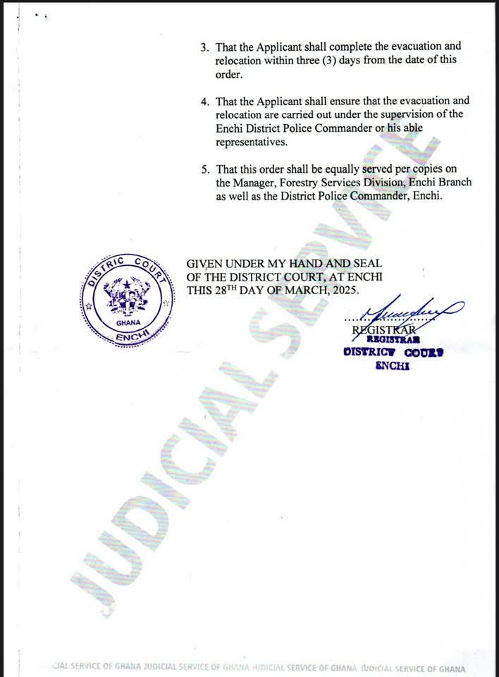 Per the ruling, the Forestry Services Division at Enchi must “forthwith allow the Applicant to evacuate and relocate the two (2) Lingong Excavator machines and other mining equipment from the Forest Reserve to a place of his choice outside the Reserve.”