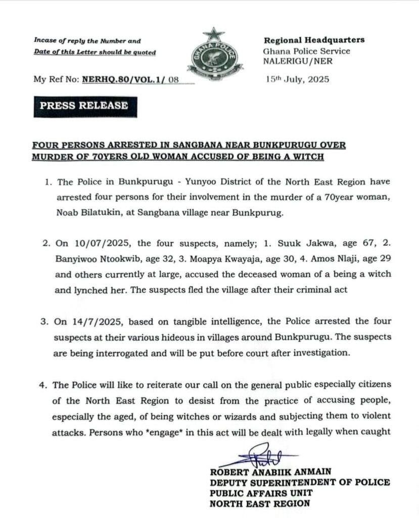 The Police have strongly reiterated their call on the public particularly residents of the North East Region — to refrain from accusing individuals, especially the elderly, of witchcraft and subjecting them to violence. The statement warned that anyone involved in such acts would be arrested and prosecuted in accordance with the law.