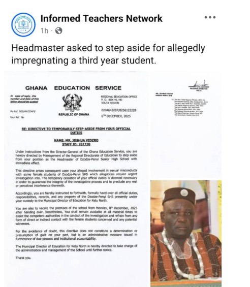 The Regional Directorate of Education has directed the Headmaster of Diodze-Penyi Senior High School to step aside immediately over allegations of sexual misconduct involving female students.