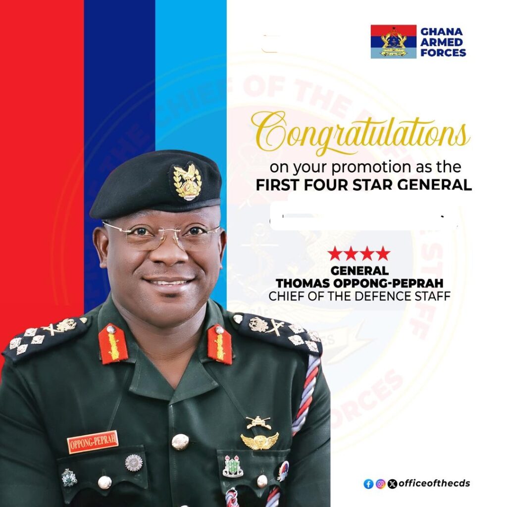 The Commander-In-Chief of Ghana Armed Forces (GAF) and President of the Republic of Ghana, Nana Akufo-Addo, has promoted the Chief of the Defence Staff (CDS) of Ghana’s Military, from the rank of Lieutenant General (Lt Gen), to a Four-Star General.