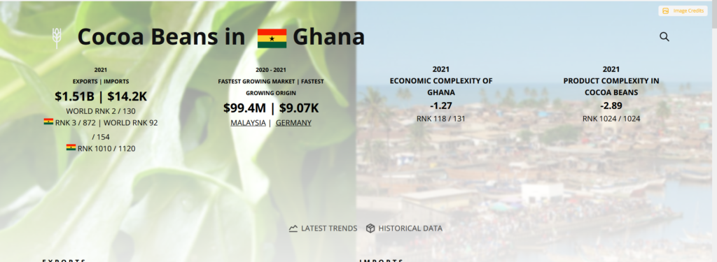 In 2021, Ghana imported $14.2k in Cocoa Beans, mainly from Germany ($10.9k) and Nigeria ($3.23k).In the same year 2021, Ghana exported $1.51B in Cocoa Beans, making it the 2nd largest exporter of Cocoa Beans in the world. At the same year, Cocoa Beans was the 3rd most exported product in Ghana. The main destination of Cocoa Beans exports from Ghana are: Netherlands ($230M), Malaysia ($216M), United States ($130M), Brazil ($115M), and France ($96.3M).