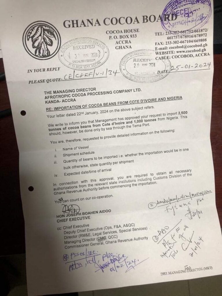 The letter, which has a number of official stamps and minuting, was in response to a request made to Ghana Cocoa Board on January 22, 2024, seeking approval to import the raw Cocoa Beans to meet its its production needs.