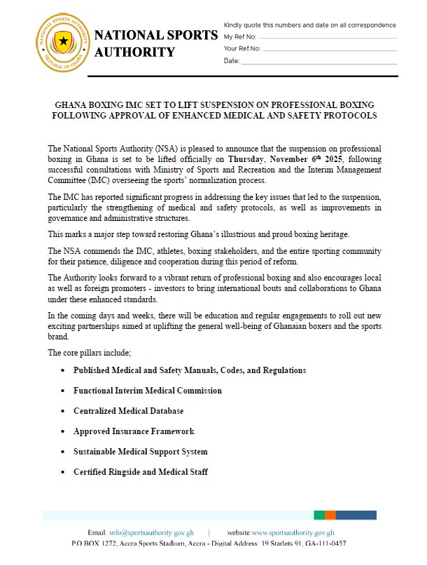 The National Sports Authority (NSA) has announced that the suspension on professional boxing in Ghana will officially be lifted on Thursday, November 6, 2025, following extensive consultations with the Ministry of Youth and Sports and the Interim Management Committee (IMC) overseeing the sport’s normalisation process.
