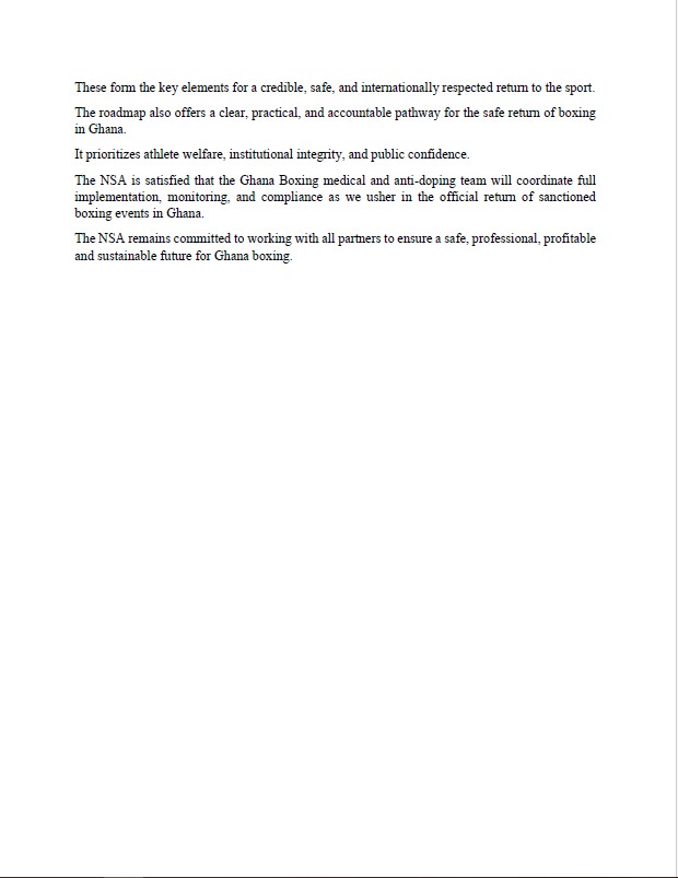 The NSA further assured that the Ghana Boxing Medical and Anti-Doping Team will lead the implementation, monitoring, and compliance of all safety and medical measures as sanctioned events resume across the country.