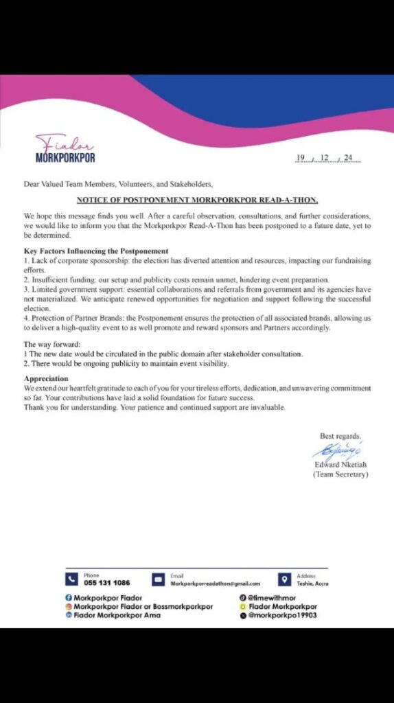 “We hope this message finds you well. After careful observation, consultations, and further considerations, we would like to inform you that the Morkporkpor Read-A-Thon has been postponed to a future date, yet to be determined.