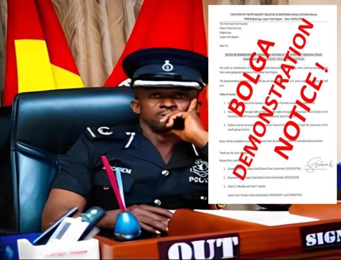 A coalition of youth groups has officially informed the Ghana Police Service about a “peaceful demonstration” its members are set to stage against the Upper East Regional Police Commander, DCOP Raymond Wejong Ali Adofiem.