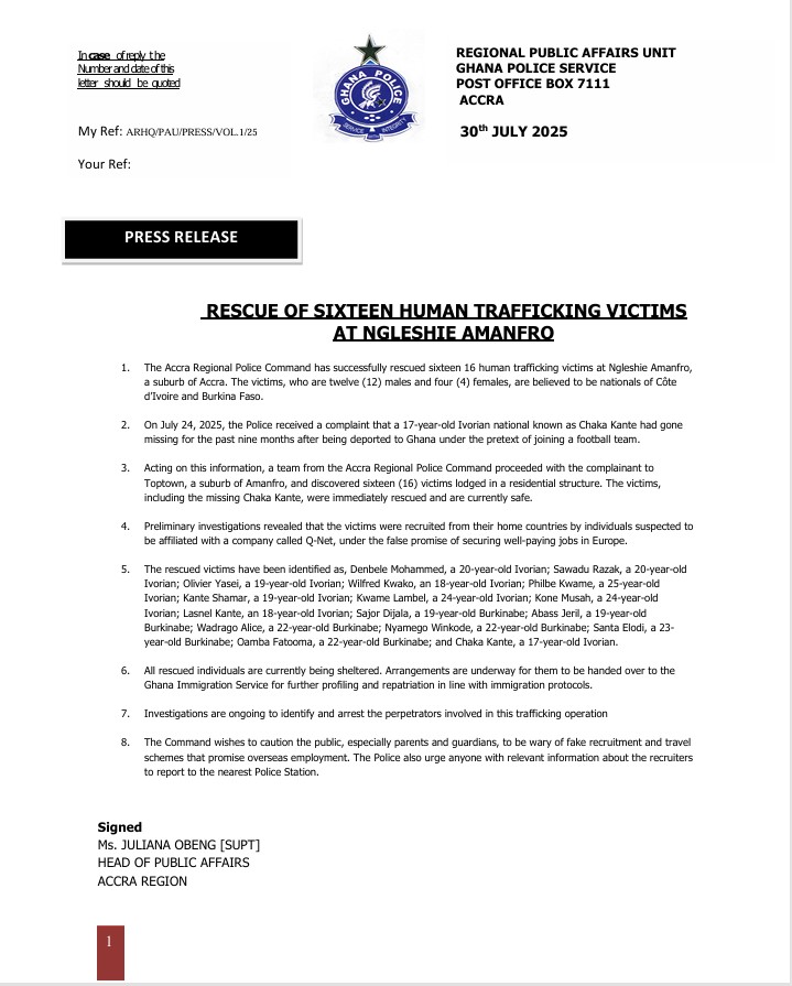On July 24, 2025, the Police received a complaint about a 17-year-old Ivorian national, Chaka Kante, who had been missing for the past nine months after reportedly being brought to Ghana under the pretext of joining a football team.