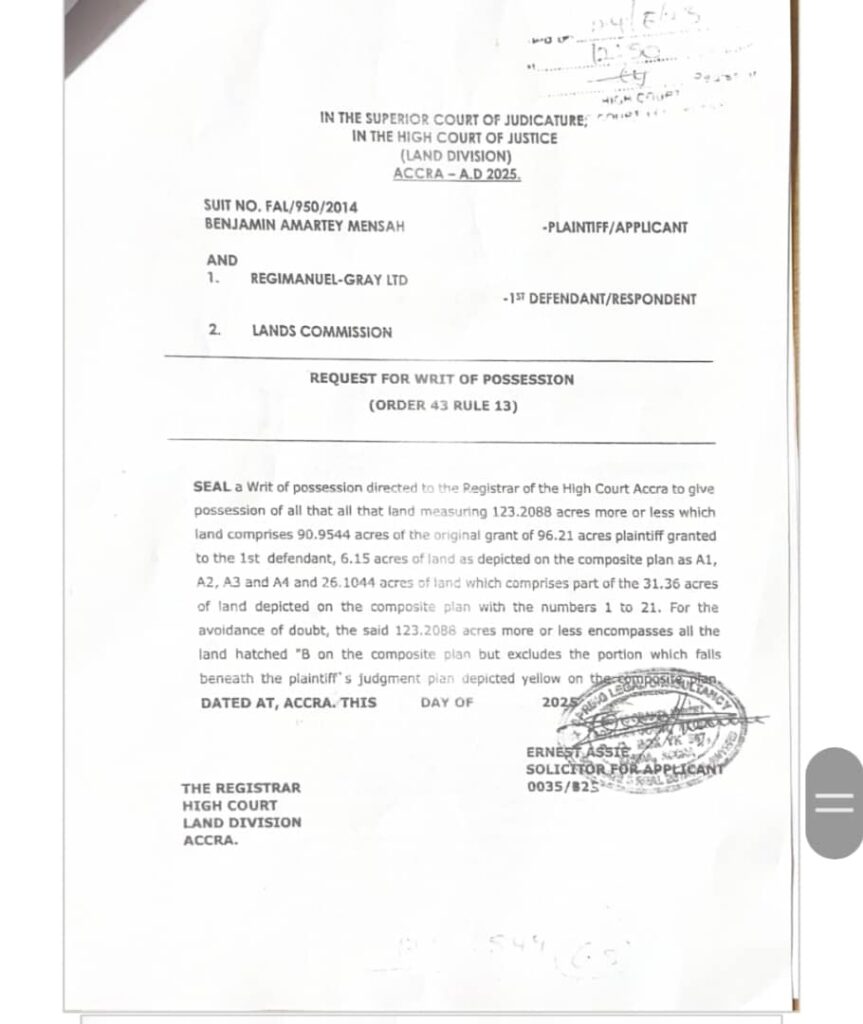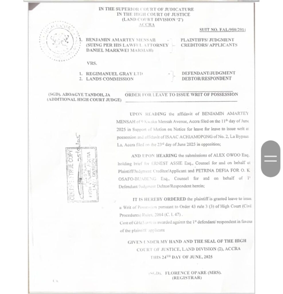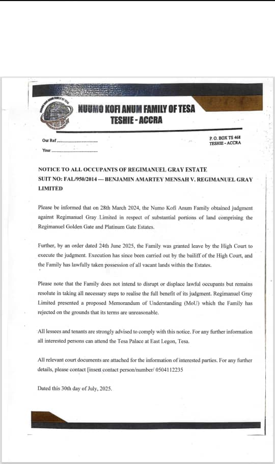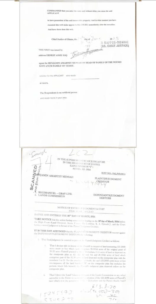 The Numo Kofi Anum family of Tesa has officially reclaimed ownership of a significant stretch of land previously held by Regimanuel Grey Limited, following a recent High Court judgment and possession order. The ruling brings closure to a land dispute that has spanned over three decades.