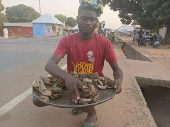 At just 21 years old, Nambu Christopher, a Senior High School graduate, spends his days walking from house to house selling fresh and dried fish to support his family. A former student of Bishop Herman Senior High School in Kpando, Volta Region, Christopher has been in the fish business for 12 years, long before he stepped into a classroom as a teenager.