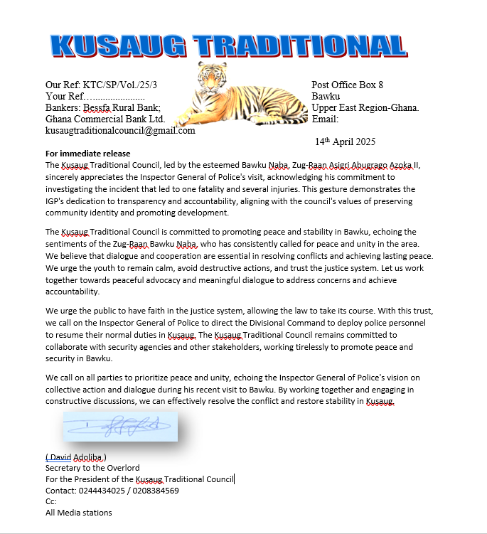 The Kusaug Traditional Council, under the leadership of the Bawku Naba, Zug-Raan Asigri Abugrago Azoka II, expresses its sincere appreciation to the Inspector General of Police (IGP), Christian Tetteh Yohuno, for his recent visit to Bawku. The Council acknowledges the IGP’s commitment to investigating the tragic incident that led to the loss of one life and injuries to several others.
