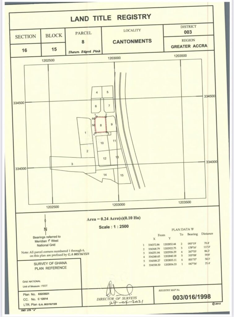 The land is located within the Giffard Road Layout Extension Area at Cantonments, Accra, under the jurisdiction of the La Dade Kotopon Municipal Assembly in the Greater Accra Region.