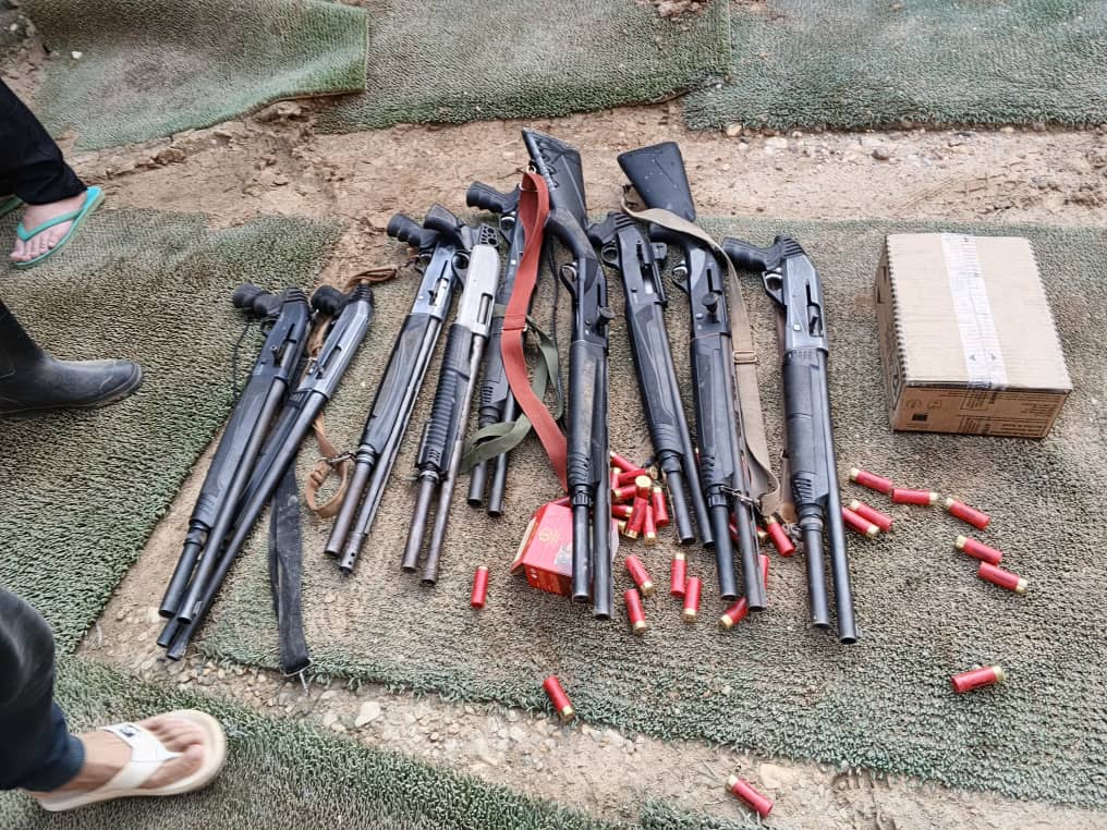 A Nissan Navara pickup truck, a pump-action gun with four cartridges, and several mobile phones belonging to the suspects were seized. The operation also uncovered two excavators, along with large mounds of sand and pay dirt, indicating extensive environmental damage to the area’s water bodies and farmlands.