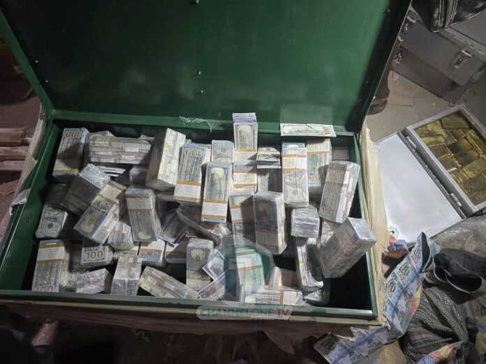 National Security seizes large sums of cash, counterfeit currency, and suspected gold bars in a warehouse raid at Sapeiman. A manhunt is underway for suspects.