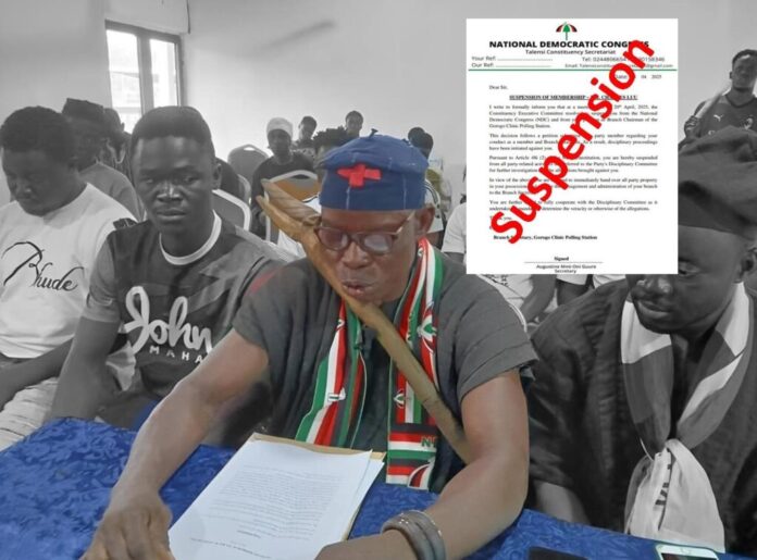 The governing National Democratic Congress (NDC) has suspended a branch chairman in Talensi, a constituency in the Upper East region, after he led a protest news conference recently against a district chief executive (DCE) nominee.