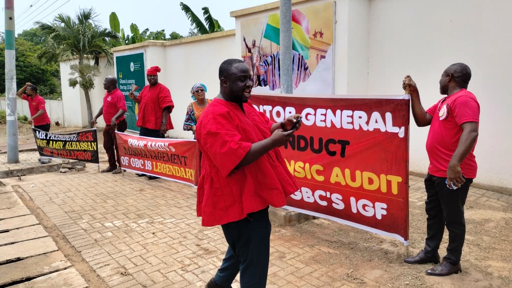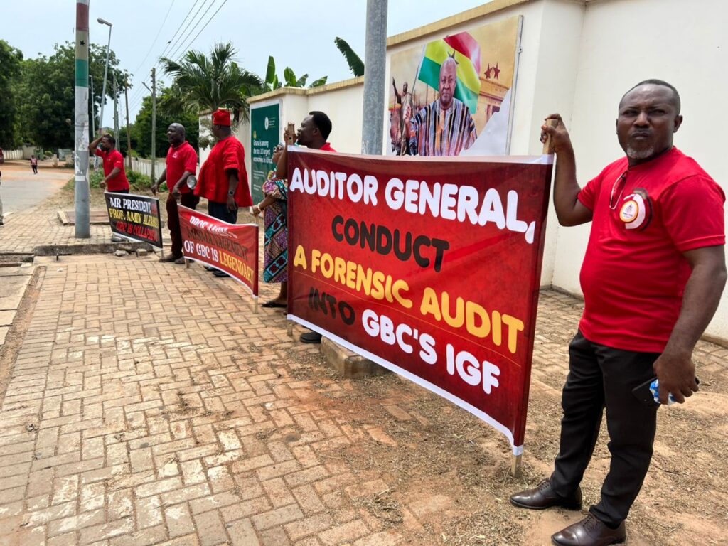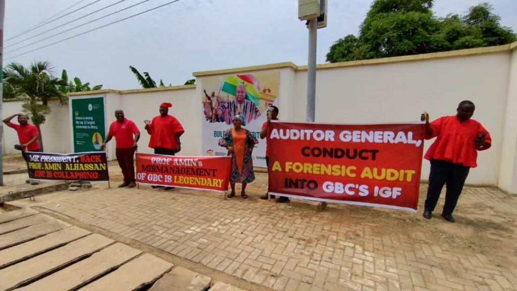 In a peaceful but emotionally charged protest, the Joint GBC Union demanded that Director-General Professor Amin Alhassan proceeds on leave to allow a forensic audit into the corporation’s finances from 2019 to date.