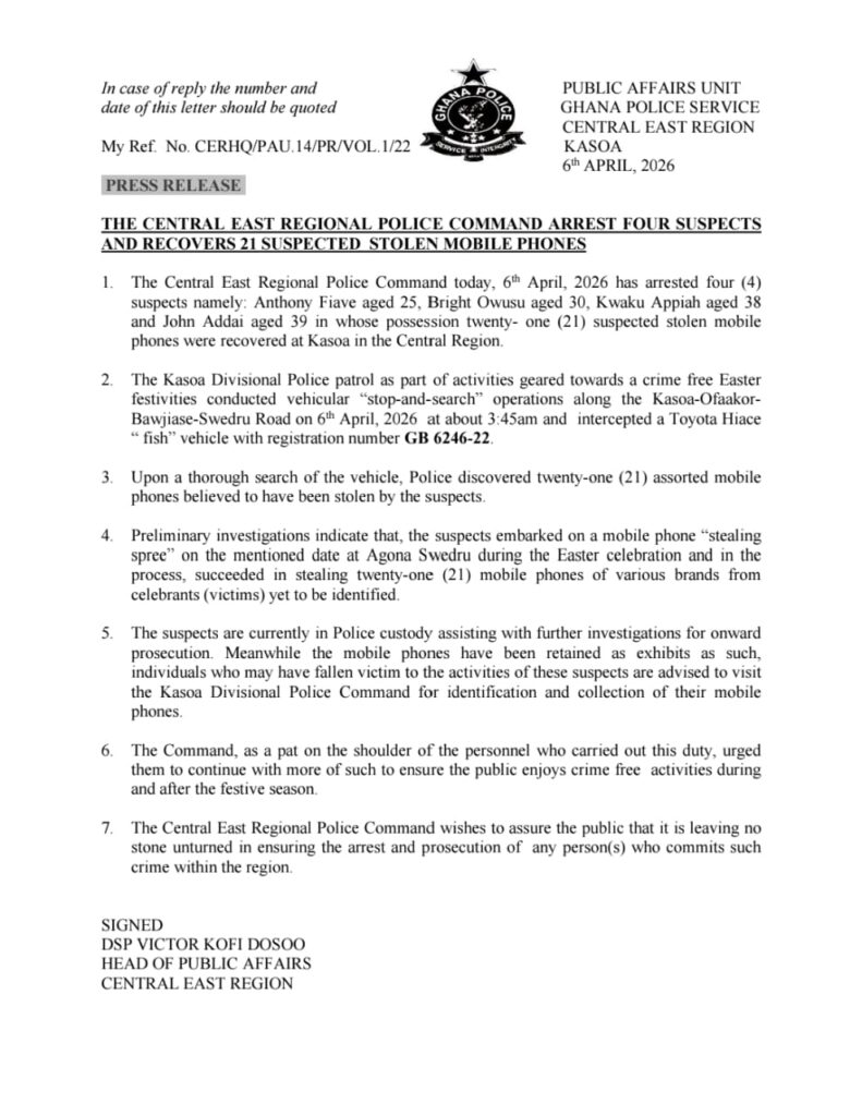 The Central East Regional Police Command has arrested four suspects at Kasoa in the Central Region after recovering twenty-one mobile phones believed to have been stolen during Easter festivities.