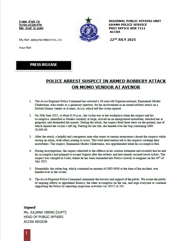 The Accra Regional Police Command has arrested a 36-year-old Nigerian national, Emmanuel Okafor Chukwuma, for his involvement in an armed robbery attack on a Mobile Money vendor at Avenor, Accra, which left the victim injured.