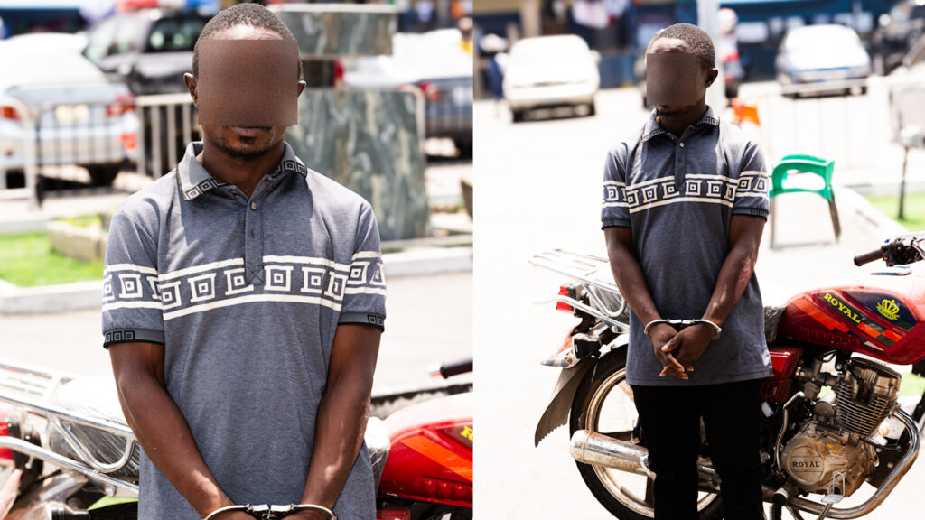 The incident occurred on 30th June 2025 at about 8:30 p.m., when the victim was at her workplace. The suspect and his accomplice, identified as Emeka (currently at large), arrived on an unregistered motorbike, attacked her at gunpoint and demanded her money. During the attack, the suspect fired three shots on the ground, one of which struck the victim’s left leg. Fearing for her life, she handed over her bag containing GHS 20,000.