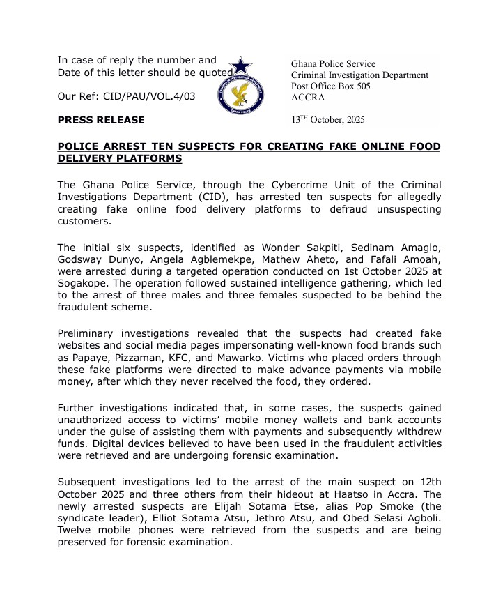 The Ghana Police Service, through the Cybercrime Unit of the Criminal Investigations Department (CID), has arrested ten suspects for allegedly creating fake online food delivery platforms to defraud unsuspecting customers.