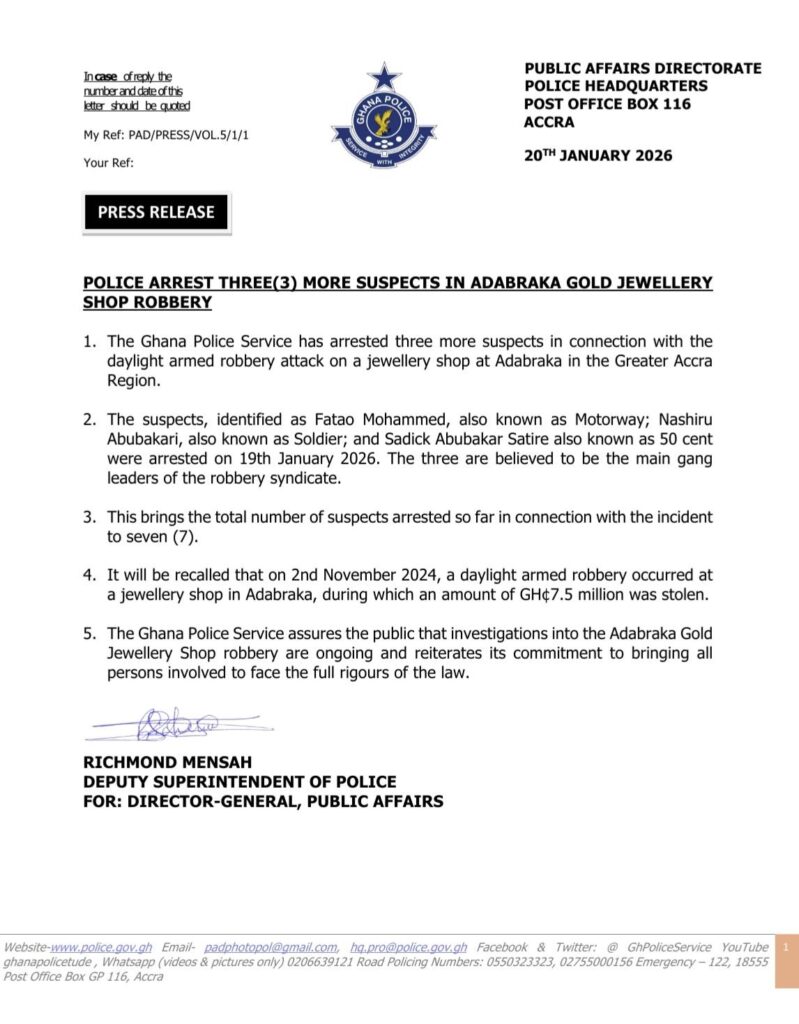The robbery, which occurred on November 2, 2024, involved a daylight armed attack on a jewellery shop at Adabraka, during which an estimated ¢7.5 million worth of valuables was stolen.