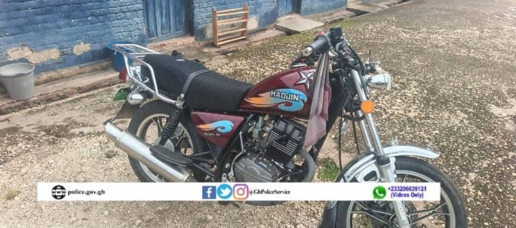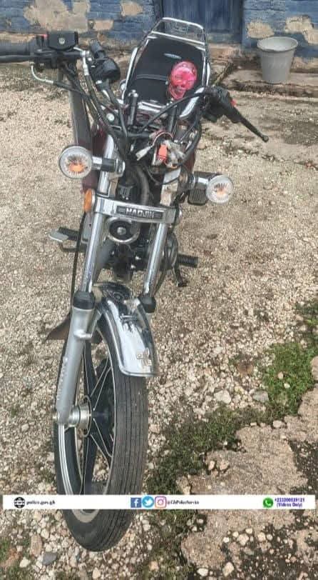 On 10th October 2025, suspect Solomon Opoku was arrested at Council Quarters, Obuasi, while attempting to sell the stolen motorbike. Subsequent investigations led to the arrest of his accomplice, Collins Aboagye, at Kokotesua, another suburb of Obuasi.