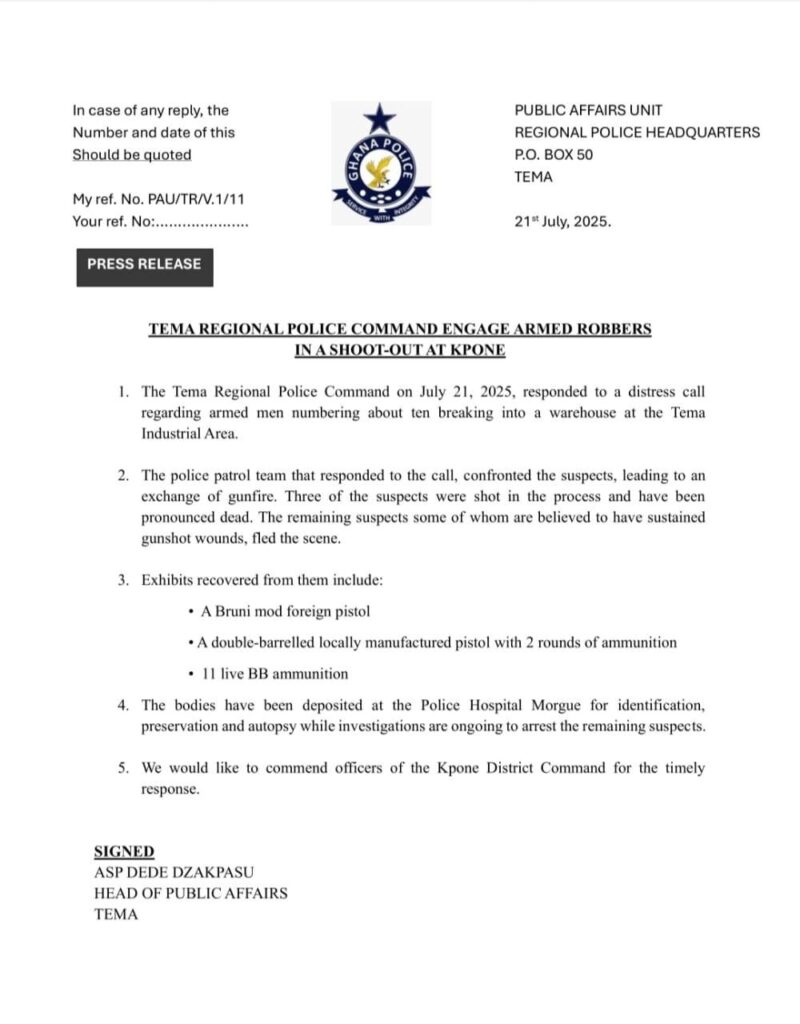 The Tema Regional Police Command on July 21, 2025, swiftly responded to a distress call reporting an armed robbery attempt by about ten men at a warehouse in the Tema Industrial Area.