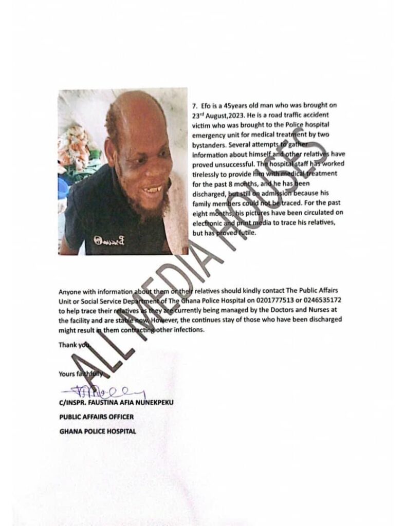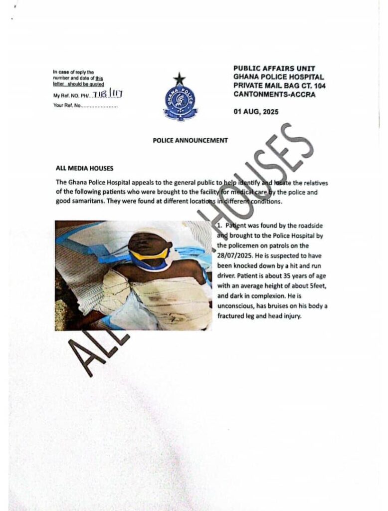 The Police Hospital in Accra is appealing to the general public for assistance in identifying and locating the relatives of several patients currently receiving medical care at the facility.