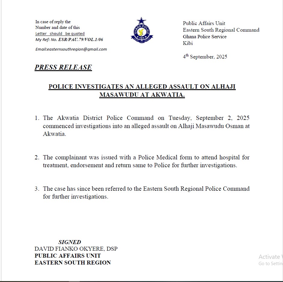 The Akwatia District Police Command has launched investigations into an alleged assault on Alhaji Masawudu Osman, a respected community member, which occurred on Tuesday, September 2, 2025.