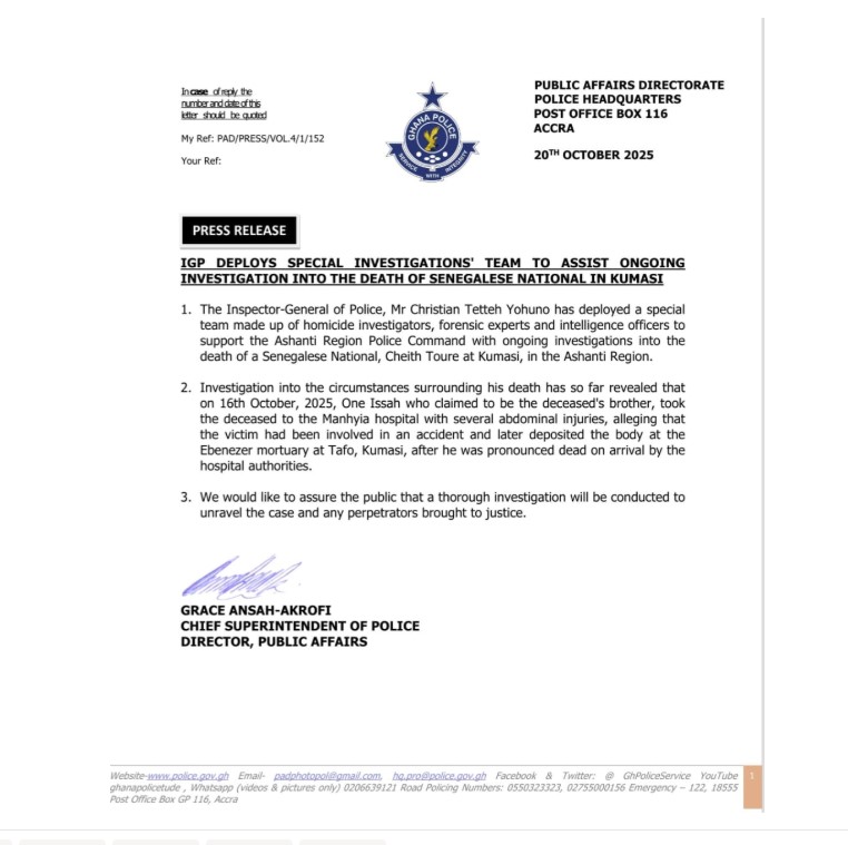 The Ashanti Regional Police Command says it is working tirelessly to uncover the full circumstances surrounding Toure’s death and to ensure justice is served.