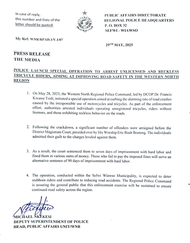 The Western North Regional Police Command, under the leadership of DCOP Dr. Francis Kwame Tsidi, has launched a special enforcement operation to tackle the rising number of road crashes caused by reckless tricycle and motorcycle riders.