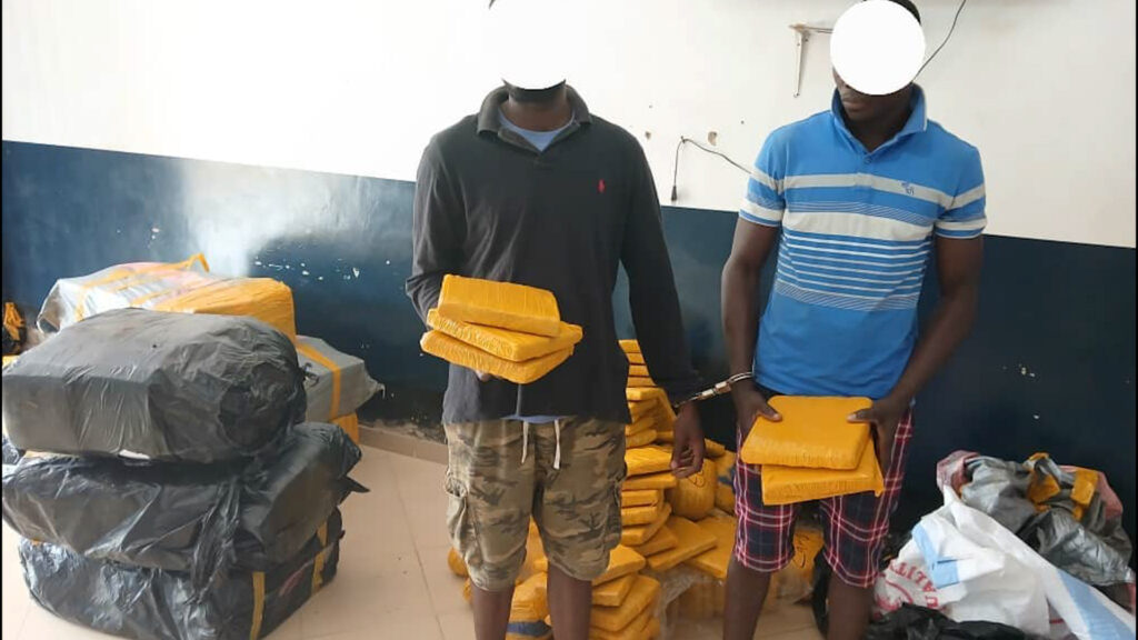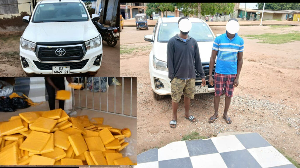 The operation, carried out at about 7:40 a.m. on Monday, August 11, 2025, was led by the Nyanyano District Police patrol team. The suspects — Eric Nkyeke, 30, and Francis Klu, 28 — were reportedly offloading the parcels from a Toyota Hilux pickup truck with registration number GS-6849-21 when they were apprehended.