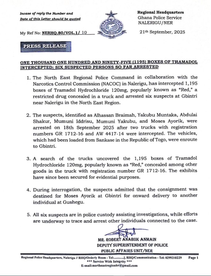 The North East Regional Police Command, in collaboration with the Narcotics Control Commission (NACOC) in Nalerigu, has intercepted a massive consignment of 1,195 boxes of Tramadol Hydrochloride 120mg, popularly known as āRedā, concealed in a truck at Gbintri near Nalerigu.