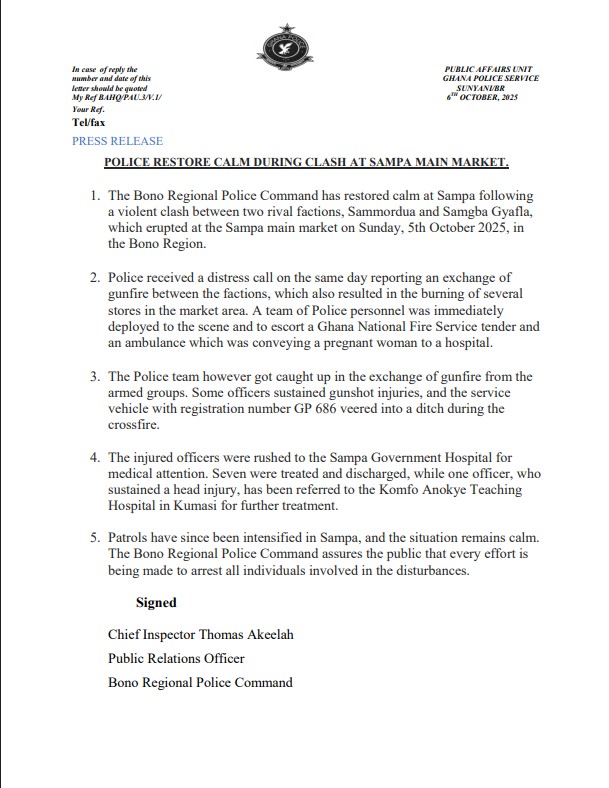 The Bono Regional Police Command has restored calm in Sampa, in the Jaman North District of the Bono Region, following a violent clash between two rival factions, Sammordua and Samgba Gyafla, at the Sampa main market on Sunday, October 5, 2025.