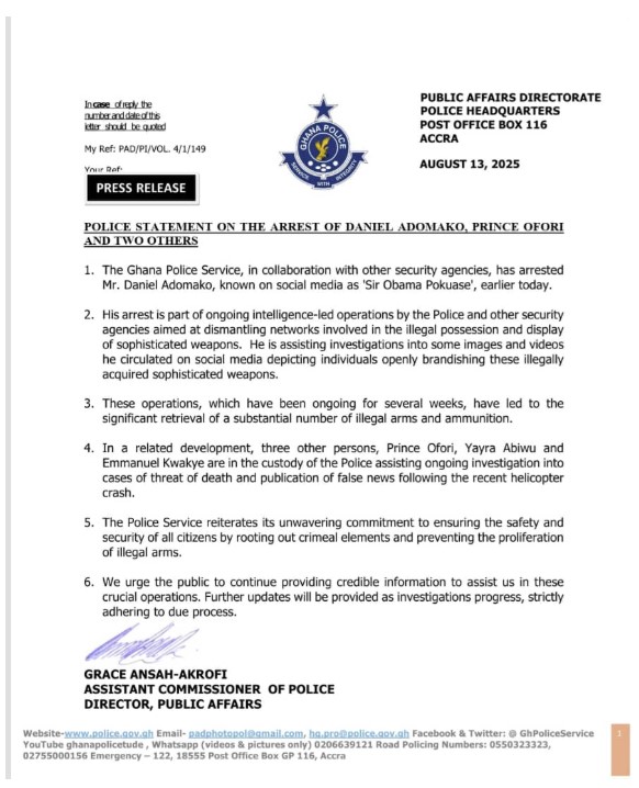 Police Statement on the arrest of Daniel Adomako, Prince Ofori, and two others.