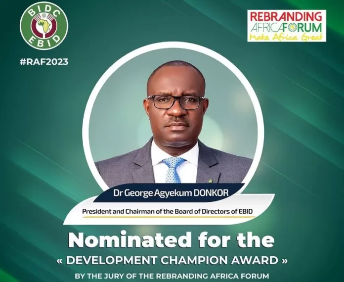 In a landmark achievement, the President and Chairman of the Board of Directors of ECOWAS Bank for Investment and Development (EBID), Dr George Agyekum Donkor, has been nominated for yet another international honour- the Development Champion Award by the Rebranding Africa Forum.