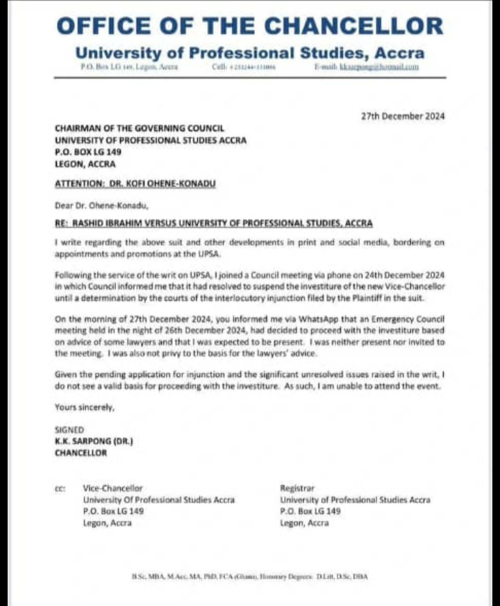 Following the service of the writ on UPSA, I joined a Council meeting via phone on 24th December 2024 in which the Council informed me that it had resolved to suspend the investiture of the new Vice-Chancellor until a determination by the courts of the interlocutory injunction filed by the Plaintiff in the suit.