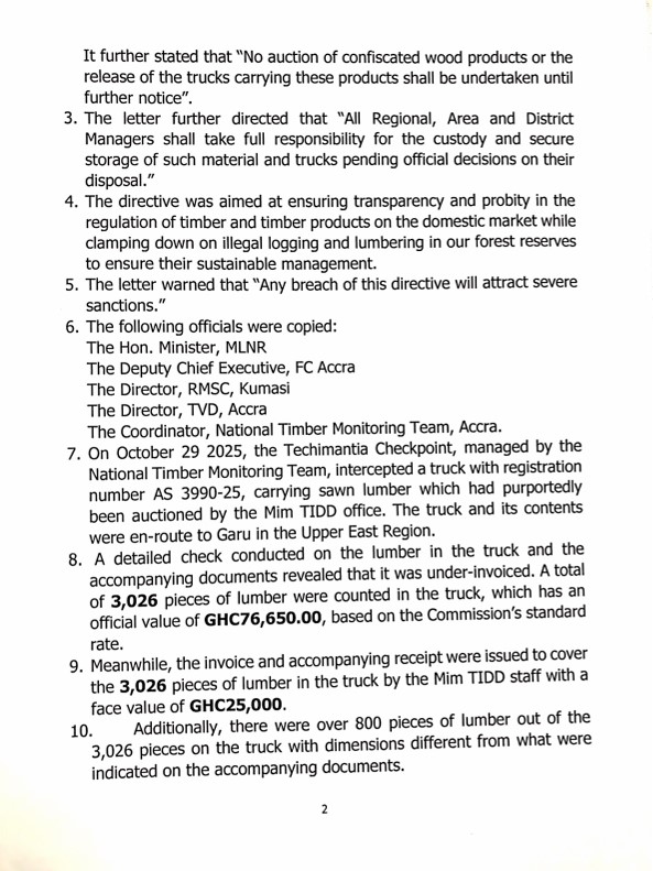 The directive instructed that all confiscated lumber, wood products and trucks conveying them be deposited at designated Forestry Commission offices, with a strict ban on auctions or releases until further notice. Regional, Area and District Managers were held responsible for the secure custody of all such items. The directive also warned of severe sanctions for any breach. The Minister for Lands and Natural Resources, relevant directors, and key unit heads were all duly copied.